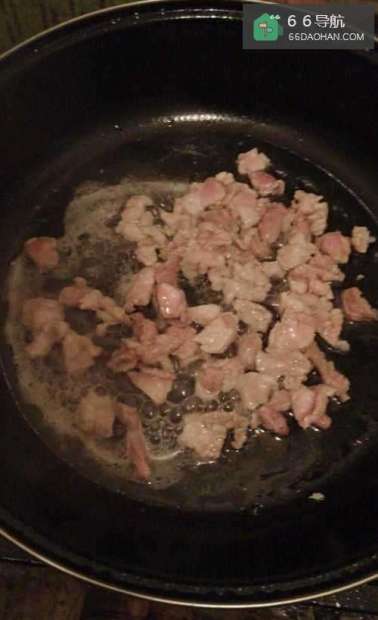3肉腌制差不多10分钟左右,点火倒入少许豆油,把肉放进油锅炼油。
