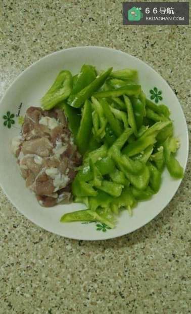 2肉和青椒切成丝,放在容器里边备用,清洗肉的时候可以放少许的食盐在里边,这个提前给肉入一下味,而且可以去除肉的腥味提升肉的质感。