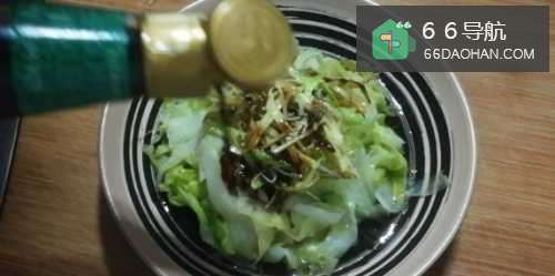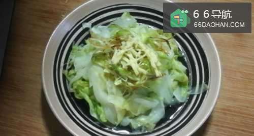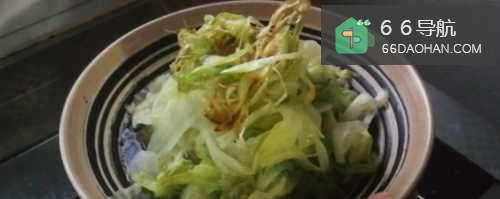 3这时候,等葱变焦黄后,我们捞出,放入在生菜上;