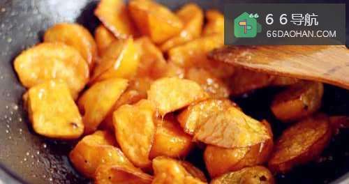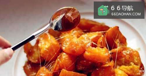 10这时再利用锅里剩余的油加适量的白糖,熬成糖稀,关火,避免糊锅,拿一个勺子再之前的热油里泡一下(是为了让勺子变热,可以减慢糖稀凝固的速度),盛一勺刚加热好的糖稀,把勺子倾斜,让热乎的糖稀慢慢流下来挂在地瓜块上反复拉丝。