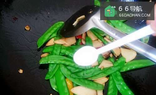4锅内倒油,煸香蒜末,下入杏鲍菇翻炒至断生后,放入荷兰豆。