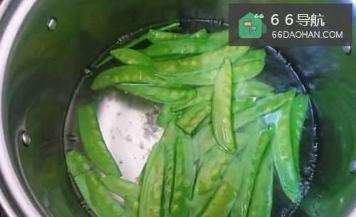 3锅中注水烧沸后,撒一勺盐,把荷兰豆倒进去焯制30秒,然后捞出过凉,沥干水份。