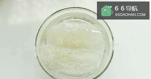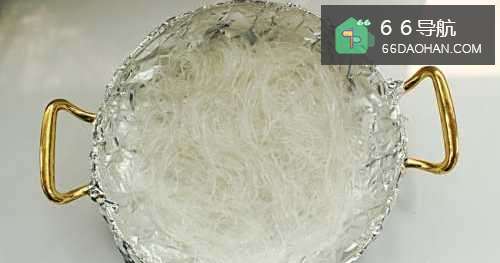 7取一个可放入烤箱高温烘烤的容器,铺锡纸,平铺上粉丝。