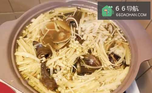 6待蛤蜊全开后,加入少许盐调味,再放入金针菇约煮1015秒即可关火上桌