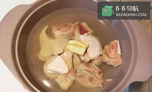2氽烫鸡腿去杂质,水滚后放入鸡腿和几片姜,约滚2分钟后捞起
