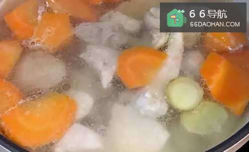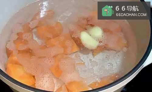 2取一汤锅加入适量的水,将红萝卜和蒜头加入煮滚,盖上锅盖继续煮5分钟后,加入马铃薯煮1015分钟至马铃薯熟软