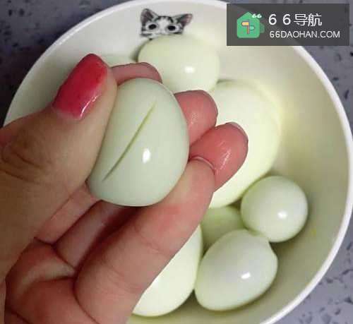 4准备些熟鹌鹑蛋、鸡蛋,并在蛋白表面划上几个痕,利于更好的入味。