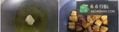 2.油下黄冰糖,再加五花肉块炒出糖色