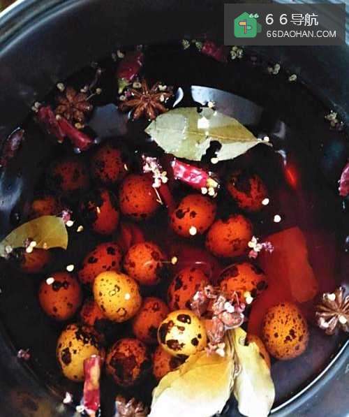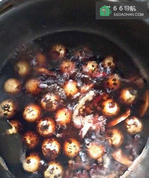 4锅内加入适量的水,一次加入八角,香叶,桂皮,干海椒,生姜,花椒,冰糖,老抽,倒入鹌鹑蛋,开大火煮开后,小火焖煮20分钟关火