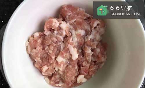2准备半碗猪肉碎,放油,盐,淀粉腌15分钟左右。