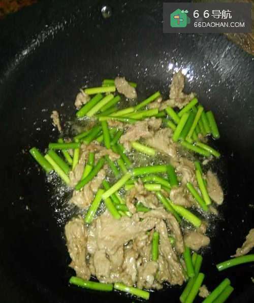 5将蒜苔下入锅里,翻炒均匀,翻炒至蒜苔被炒出香味,即可;