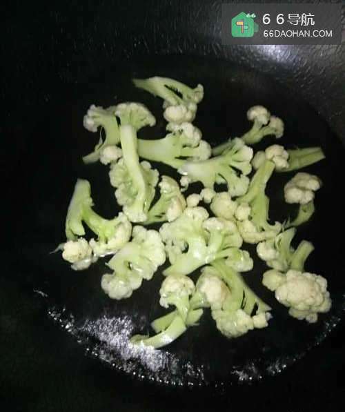 6再将花菜下入锅里,翻炒至熟,再加入盐和味精,调味好,就行了。