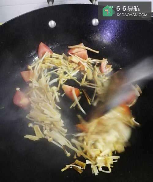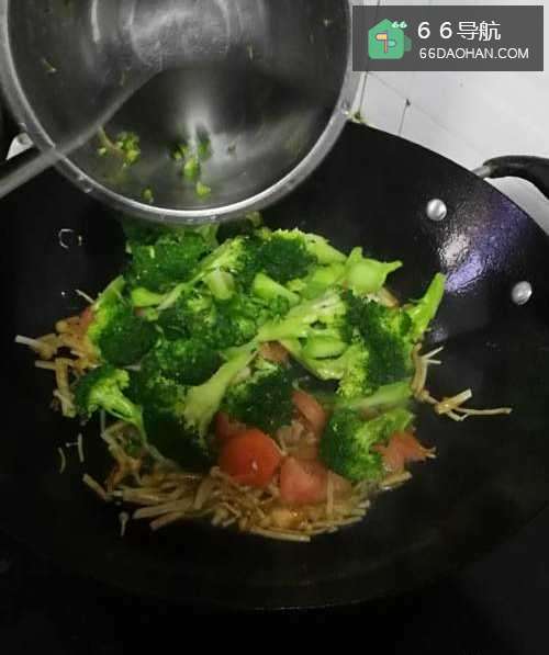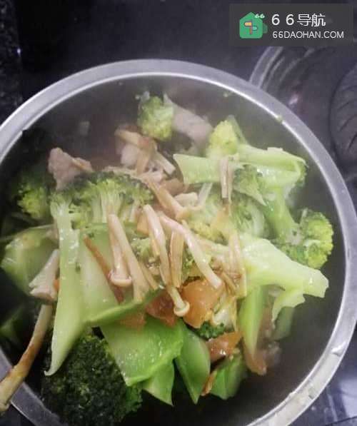 家常菜西兰花炒金针菇和西红柿混猪肉。
