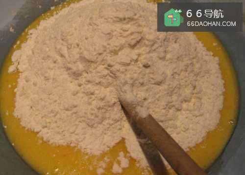 3将筛过的干粉倒入液体混合物中。