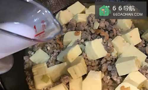 5加入豆腐、虾米水、酒和水,煮5分钟