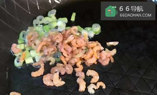 3起油锅下两小匙油爆香葱白后,下虾米炒出鲜香味
