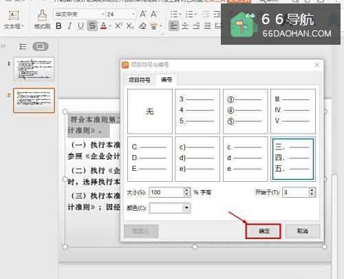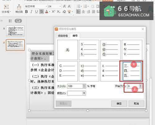 3在“项目符号和编号”对话框,选择连续上面的【编号类型】,设置【开始于】数值为【3】;