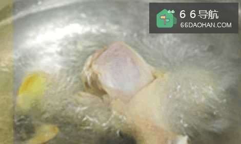 3水滚后,放入鸡腿。