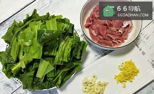 2将里脊肉切薄片,莴笋叶洗净切段,姜切末,大蒜切片