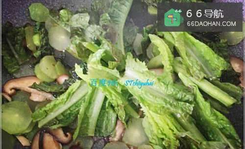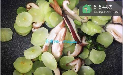 5先加入莴笋茎以及香菇片,大火混炒一阵,准备少许温开水,如果锅过热,加入少许。