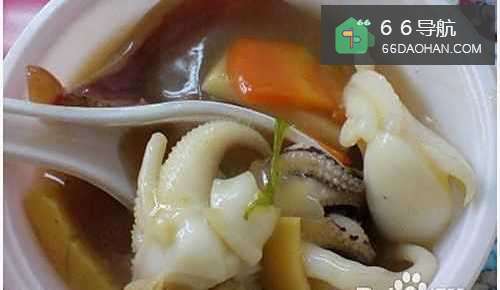 这道小吃是以新鲜的花枝和笋片、红萝卜一起快炒后,勾芡成羹汤,再加醋和糖调味;汤头尝起来咸中略带酸甜,花枝和笋片则格外鲜嫩爽口。