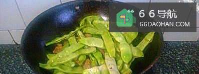 3 向锅中下入豆角并调为中火,翻炒豆角至颜色开始变绿,再将切好的土豆块放进锅内,继续翻炒到所有豆角全部变绿为止。