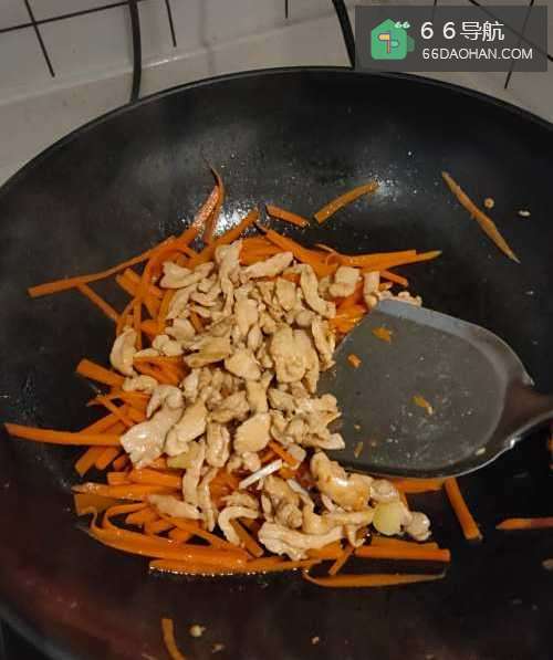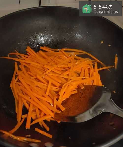 4再放点油,油热后放入胡萝卜丝翻炒,加入适量热水烧煮变软