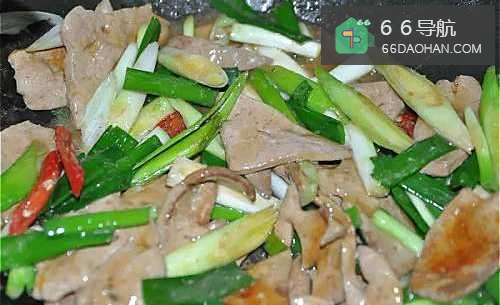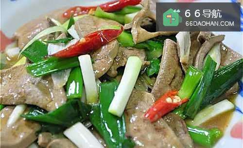 蚝油猪肝,加入葱段拌炒,又嫩又香。