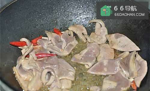 3一大匙热油,将猪肝倒入锅中快速翻炒。